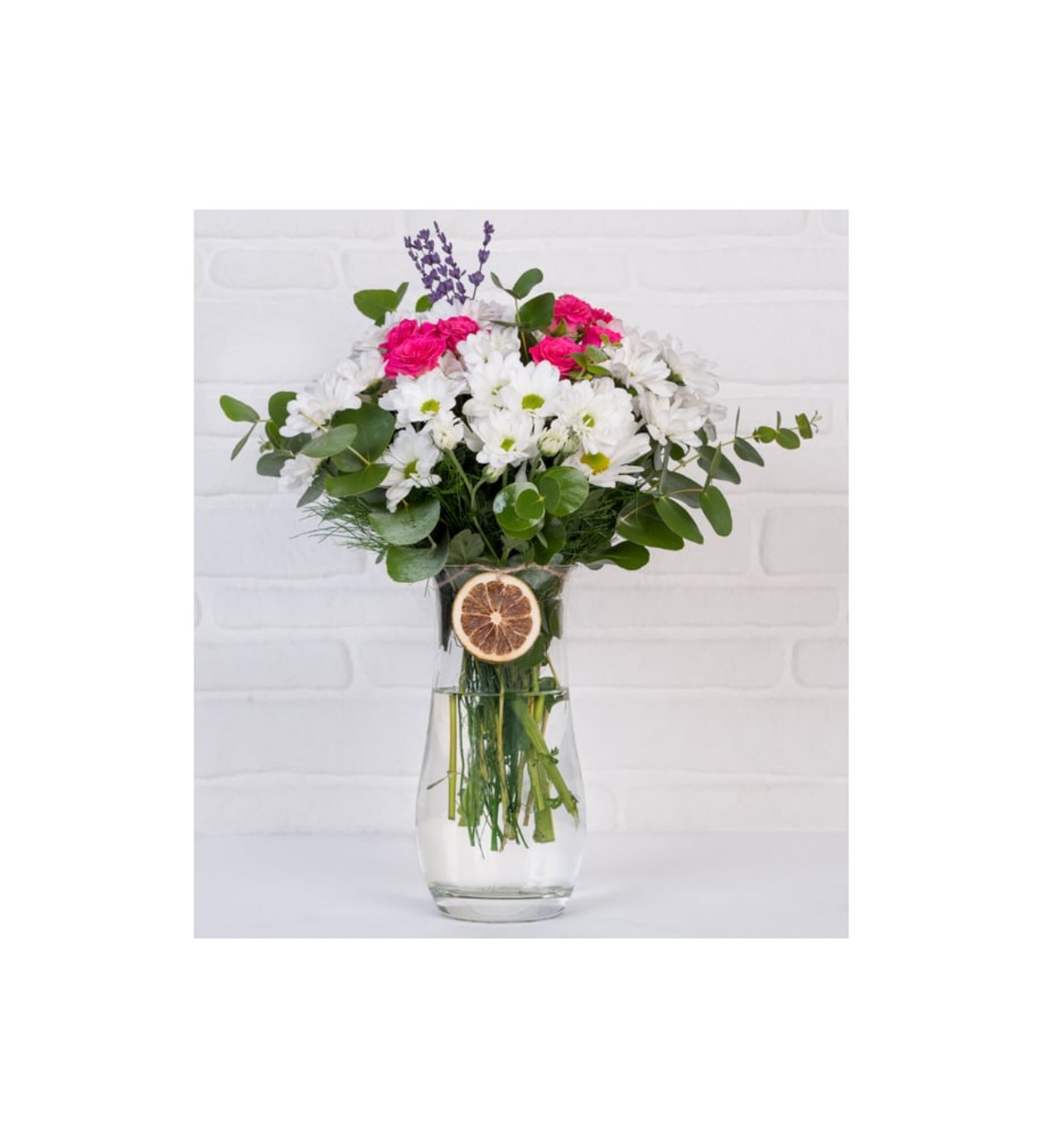 Cam Vazoda Beyaz Papatyalar ve Pembe Çardak Gül Arajmanı