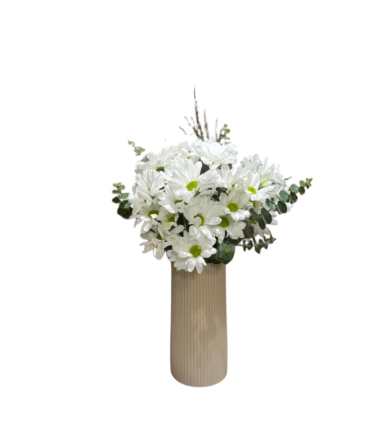 Plastik Bej Çizgili Vazoda Beyaz Papatyalar