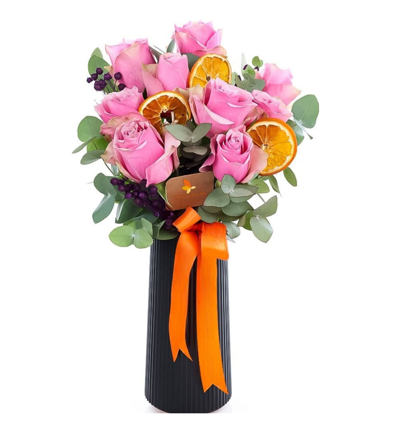 Siyah Plastik Vazoda 9 adet Pembe Gül Arajmanı