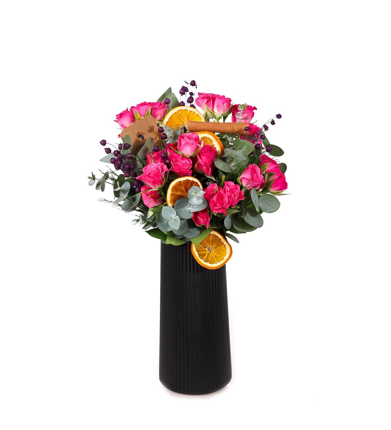 Siyah Plastik Vazoda Fuşya Çardak Gül Arajmanı