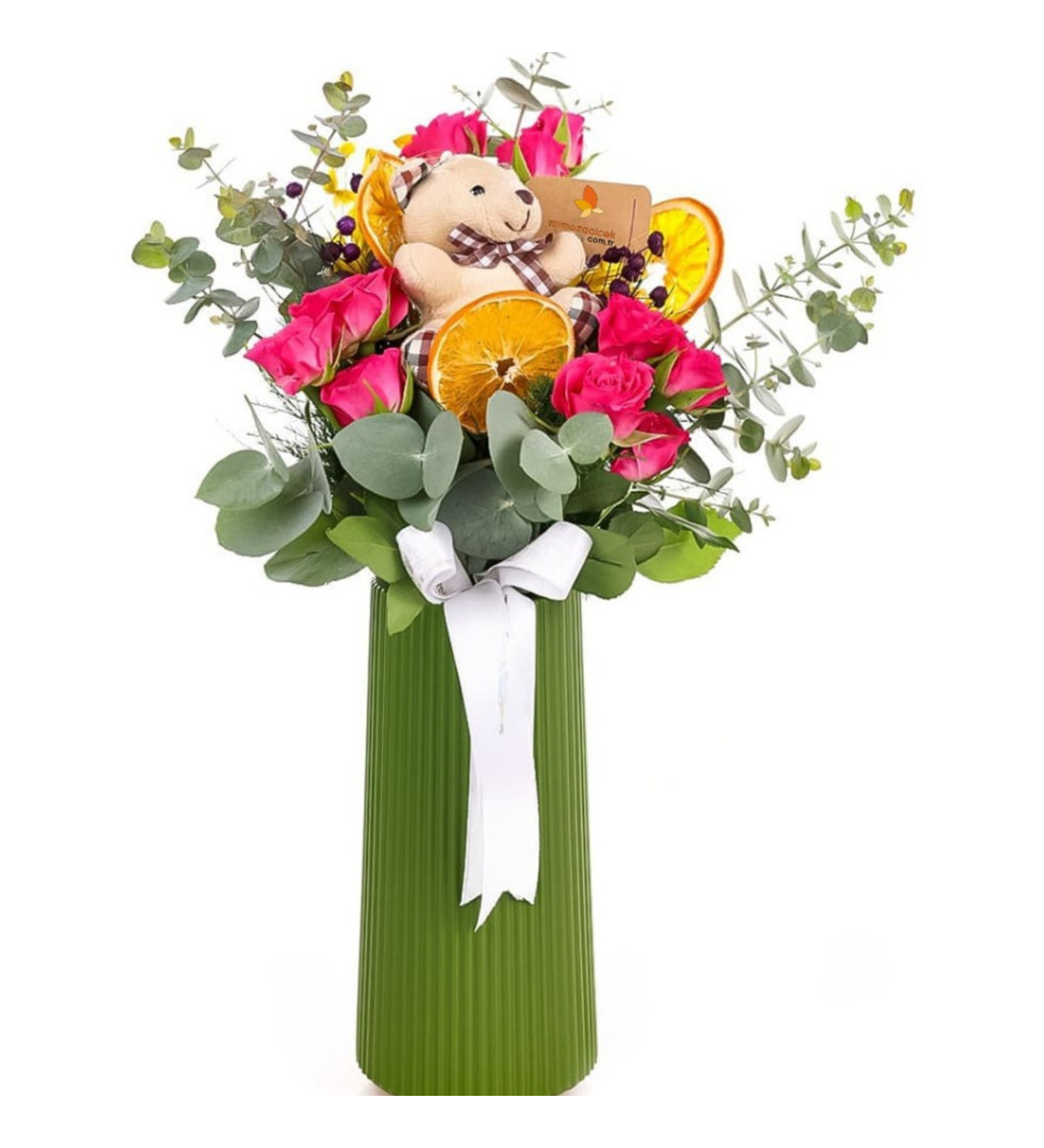 Yeşil Plastik Vazoda Fuşya Çardak Gül Arajmanı ve Mini Ayıcık
